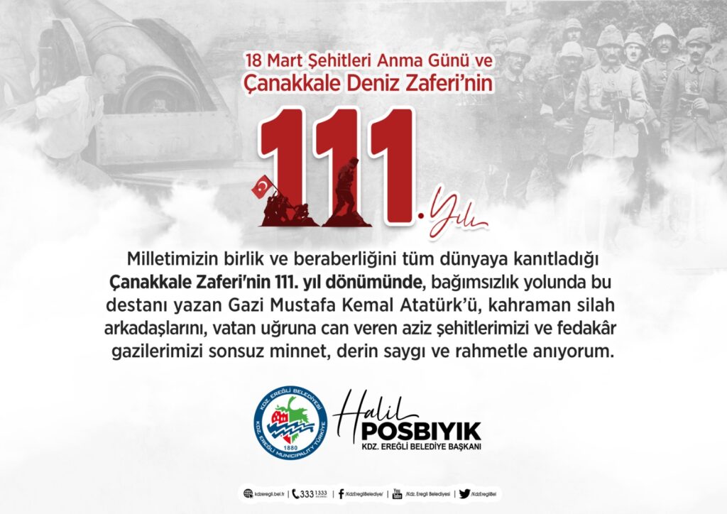 Kdz. Ereğli Belediye Başkanı Posbıyık’ın 18 Mart Şehitleri Anma Günü ve Çanakkale Zaferi’nin 111. Yıl Dönümü Mesajı