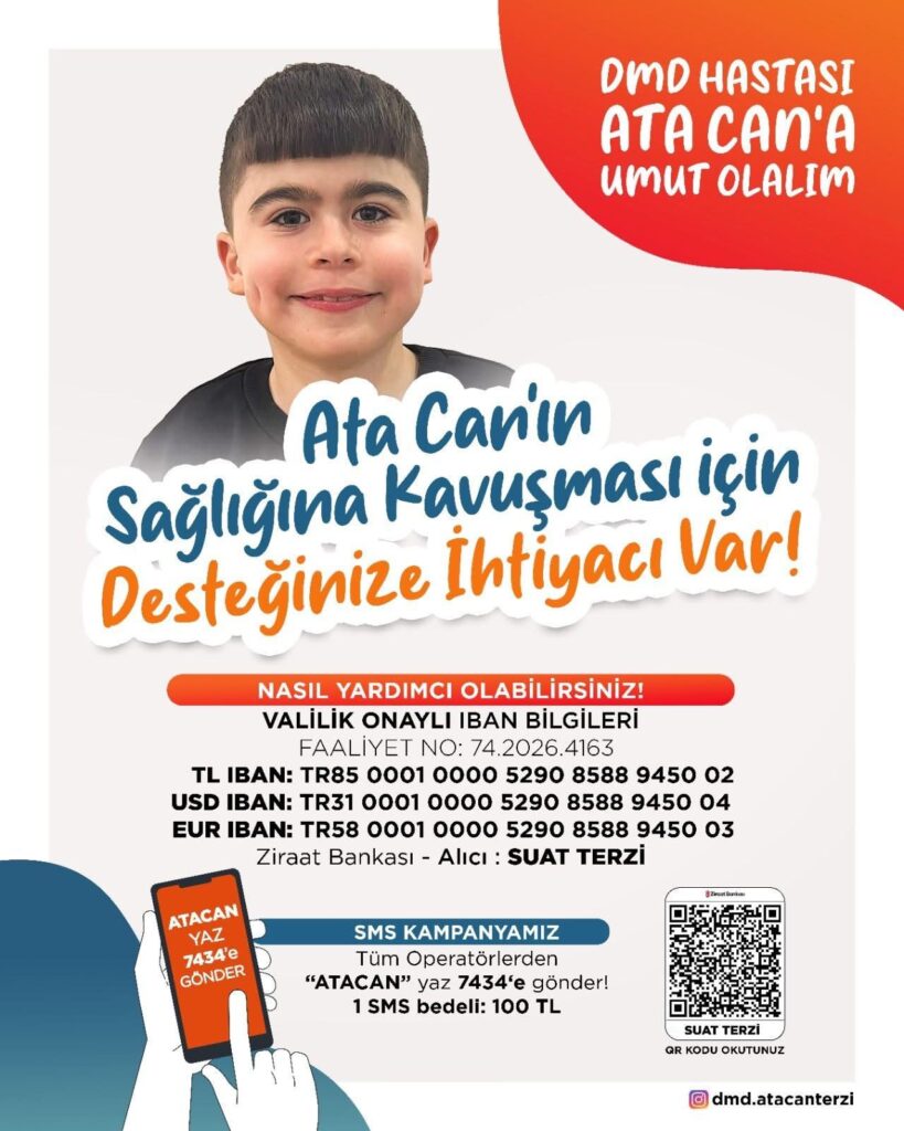 DMD (Duchenne Musküler Distrofi) hastalığı ile mücadele eden Ata Can’ın sağlığına kavuşabilmesi için yurt dışında yapılacak tedavi sürecinde desteğe ihtiyacı vardır. Valilik onaylı yardım kampanyası devam etmektedir.
